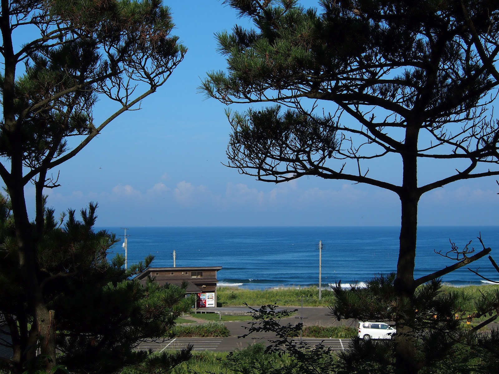若美町かんぼの里 コテージ村は、秋田県の日本海沿い、ちょうど男鹿半島の北の八郎潟と日本海に挟まれた宮沢海岸にあります。宮沢海岸を見下ろす小高い丘に作られたコテージ村からは、日本海の潮騒が聞こえてきます。